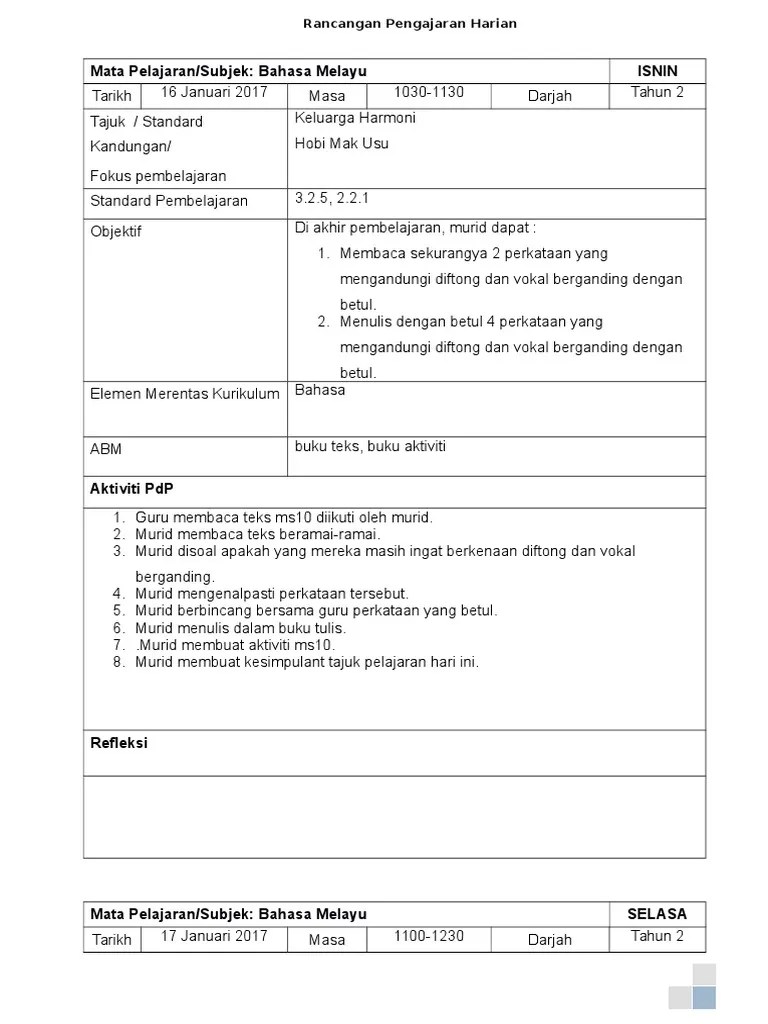 Rancangan pengajaran harian bahasa melayu tahun 1 tarikh.
